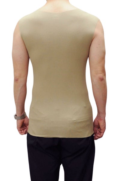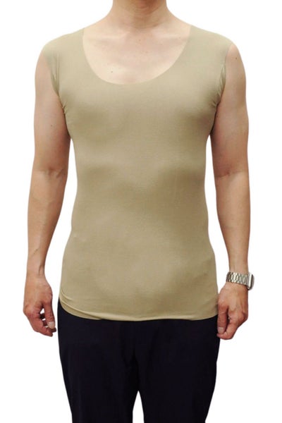 このスリーブレス(ノースリーブ)の形であれば、どんな袖丈のTシャツの中にもすっきり収まりやすく、アウターに響きにくい作りになっています。