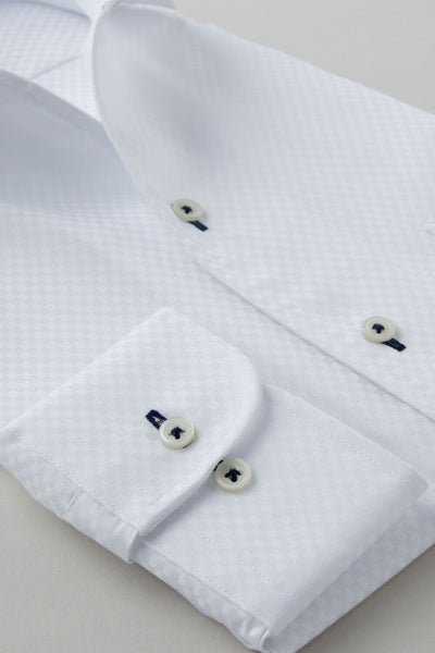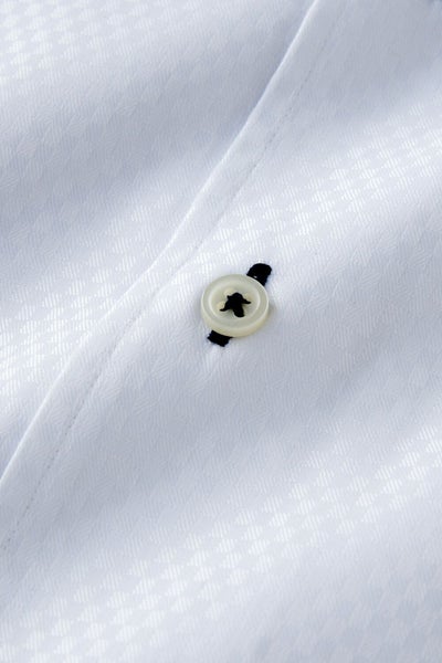 この白無地シャツは、ボタンホールとボタン付け糸に紺色の糸を使用しています。