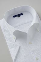 シアサッカーは凹凸のあるシボが入っていてそもそもしわ感があることから、家庭洗濯後洗いざらしでアイロンがけをせずにご着用いただけます。