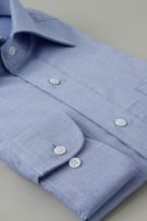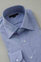 サックス無地のワイドカラーシャツ。