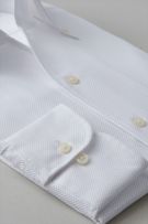 1枚の生地でつながって出来ている、衿開きのいいノーネクタイ専用シャツ=イタリアンカラー。さらに一番上にボタンのないスキッパータイプにて生産。高をやや高くすることにより、より一層衿のロールが大きく出るよう、また衿元がよりきれいに開くように仕上げました。