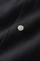 衿と前立ての裏部分がオープンカラーのように縫い目がなく、1枚の生地でつながって出来ているため、第一ボタンをはずして衿を開き気味にして着用すると衿から第一ボタンにかけてきれいなロールが出るようになっています。