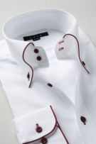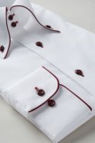 このシャツは衿の一部とカフス部分に赤のサテンテープでパイピングを施しました。