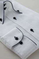 このシャツは衿の一部とカフス部分に紺のサテンテープでパイピングを施しました。