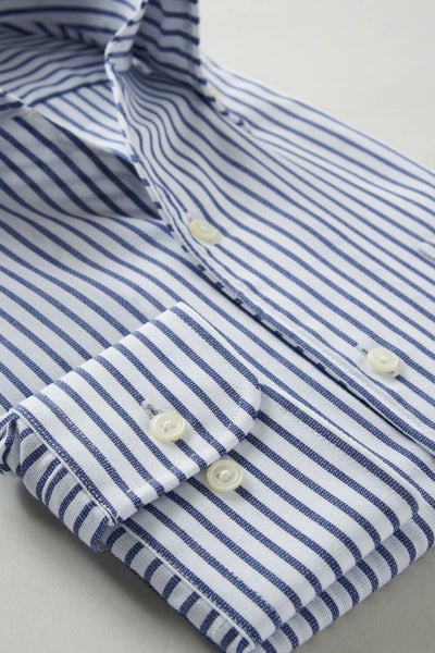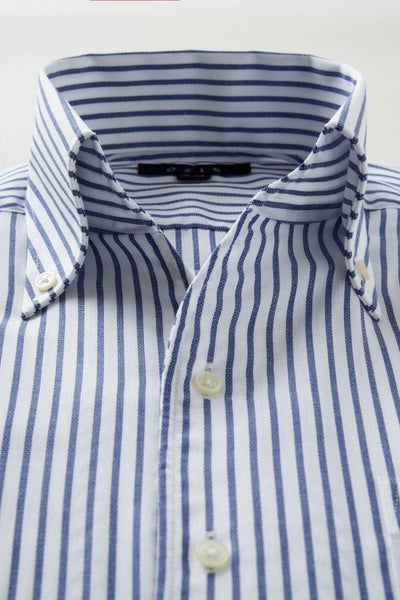 このシャツは衿と前立ての裏部分がオープンカラーのように縫い目がなく、1枚の生地でつながって出来ている、衿開きのいいノーネクタイ専用シャツ。
