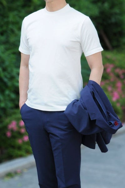 襟のリブ高めなのがスーツ・ジャケット用Tシャツとして最適!