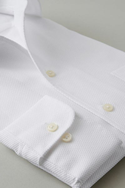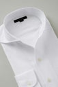 衿と前立ての裏部分がオープンカラーのように縫い目がなく、1枚の生地でつながって出来ているため、第一ボタンをはずして衿を開き気味にして着用すると衿から第一ボタンにかけてきれいなロールが出るようになっています。