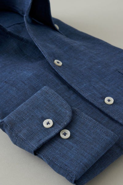 リネンシャツといえどもドレスシャツ(ワイシャツ)の仕様で生産しているため、衿元しっかり!