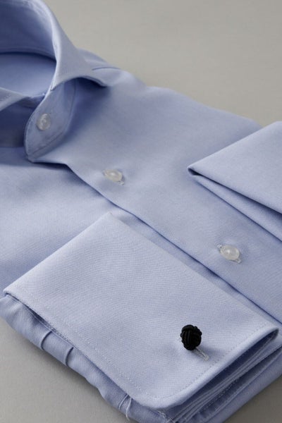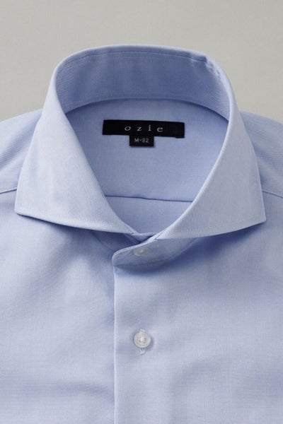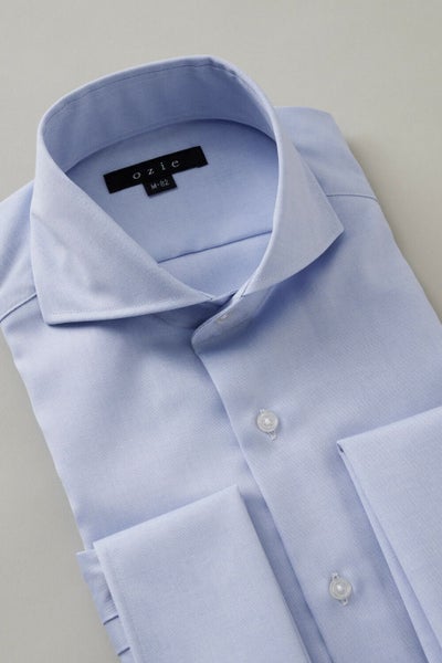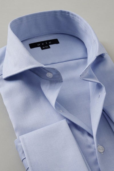 ozieではネクタイとの相性がいいホリゾンタルカラーをダブルカフス仕様にして生産。