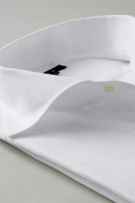 衿と前立ての裏部分がオープンカラーのように縫い目がなく、1枚の生地でつながって出来ているため、第一ボタンをはずして衿を開き気味にして着用すると衿から第一ボタンにかけてきれいなロールが出るようになっています。