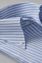 衿と前立ての裏部分がオープンカラーのように縫い目がなく、1枚の生地でつながって出来ているため、第一ボタンをはずして衿を開き気味にして着用すると衿から第一ボタンにかけてきれいなロールが出るようになっています。