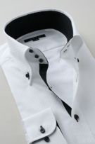 シャツでインパクトやアクセントをつけたいときにこれ以上ないノーネクタイ専用のアバンギャルドなモード系シャツ。