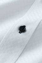 ノータイ時に第一ボタンを外したときに衿裏や前立から黒無地生地がチラッと覗くようアクセントをつけました。