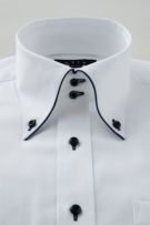 一番上のボタンを2つ縦につけることにより衿が高く、やや大きめな衿型となっています。