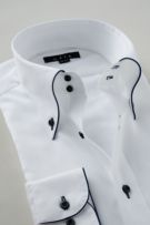このシャツは衿の一部とカフス部分に紺のサテンテープでパイピングを施しました。