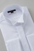 モーニングやタキシードに合わせるのに最適な、前身頃にひだ(ピンタック)のないプレーンなウィングカラーシャツです。