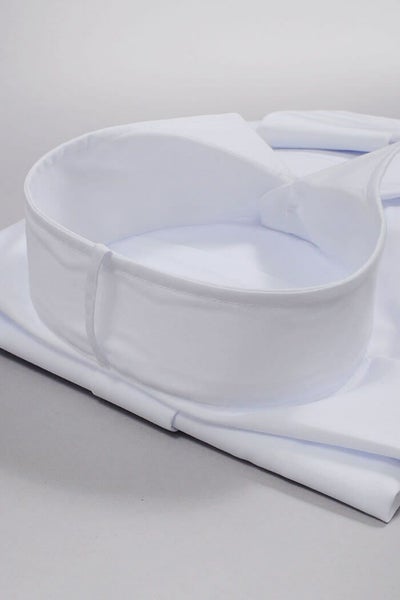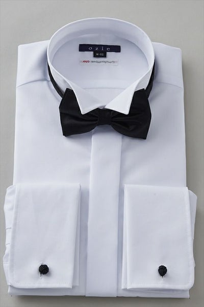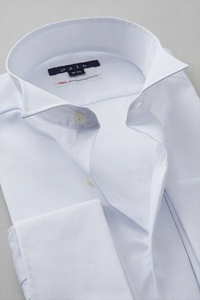 モーニングやタキシードに合わせるのに最適な、前身頃にひだ(ピンタック)のないプレーンなウィングカラーシャツです。