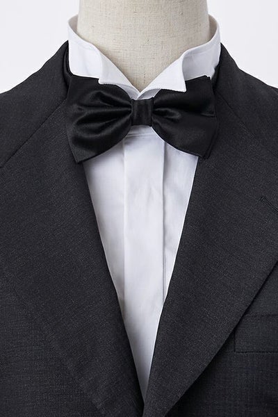 タキシードに蝶ネクタイ、モーニングに結び下げのシルバー系ネクタイといった正統派コーディネイトはもちろんのこと、