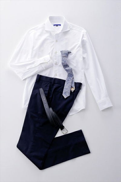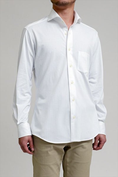 見た目はワイシャツの定番織柄である「ヘリンボーン」を再現しながら、ニット素材ならではのしなやかさと着心地の良さを備えています。