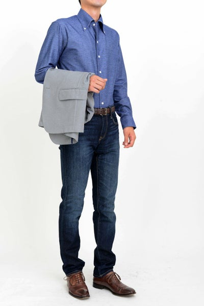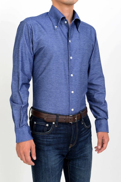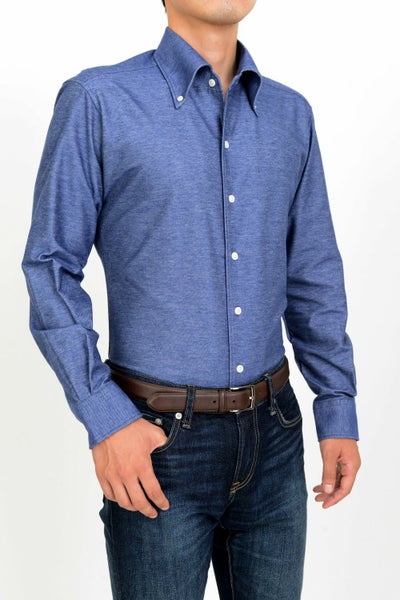 一見デニム調のカジュアルな見栄えですが、ドレッシーな仕上がりだけに、カジュアルのみならず、ビジネスカジュアルにピッタリのシャツと言えます。