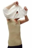 このスリーブレス(ノースリーブ)の形であれば、どんな袖丈のTシャツの中にもすっきり収まりやすく、アウターに響きにくい作りになっています。
