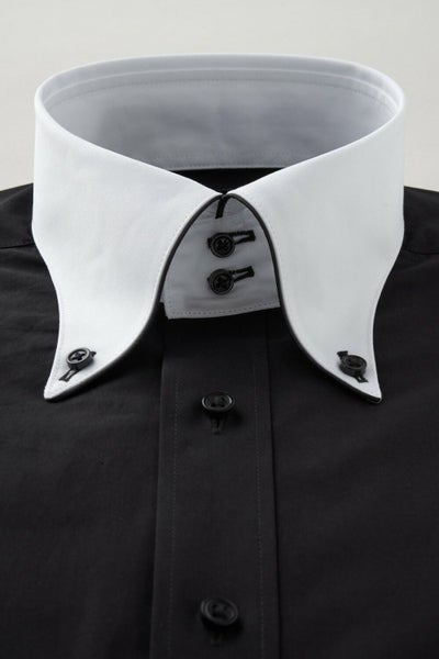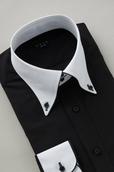 一番上のボタンを2つ縦につけることにより衿が高く、やや大きめな衿型となっています。