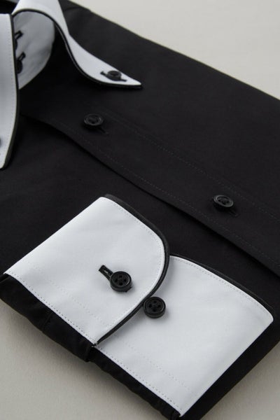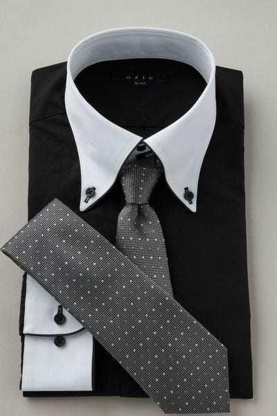 衿・カフス部分の白い生地と身頃の黒無地、そして白い生地に施されたサテンテープのコントラストがアバンギャルド!