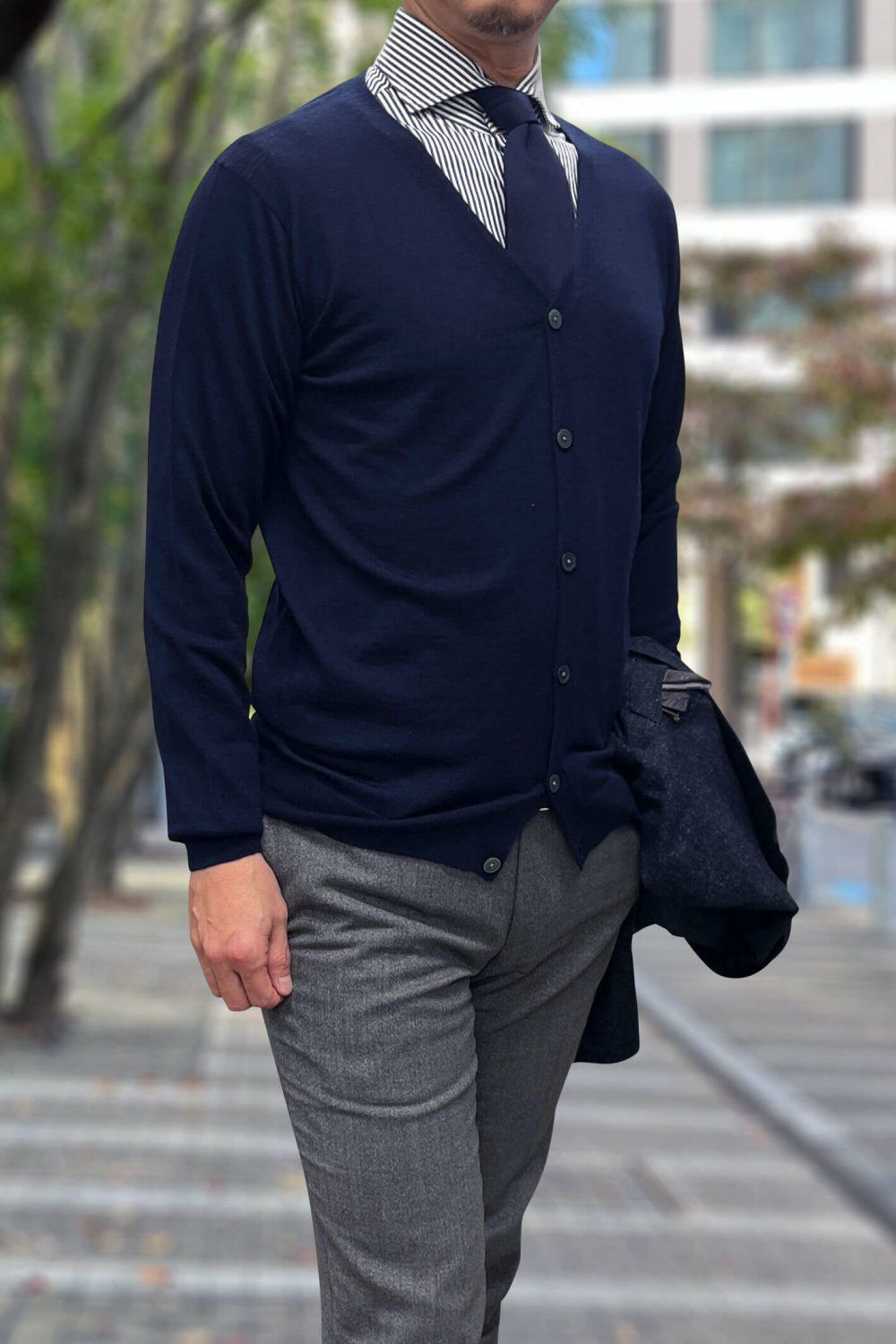昨今業種によってはビジネスのオフィスウェアのカジュアル化が進み、スーツやジャケットの下にワイシャツやカットソーと合わせて、秋冬はカーディガンを着用する方が増えてきています。