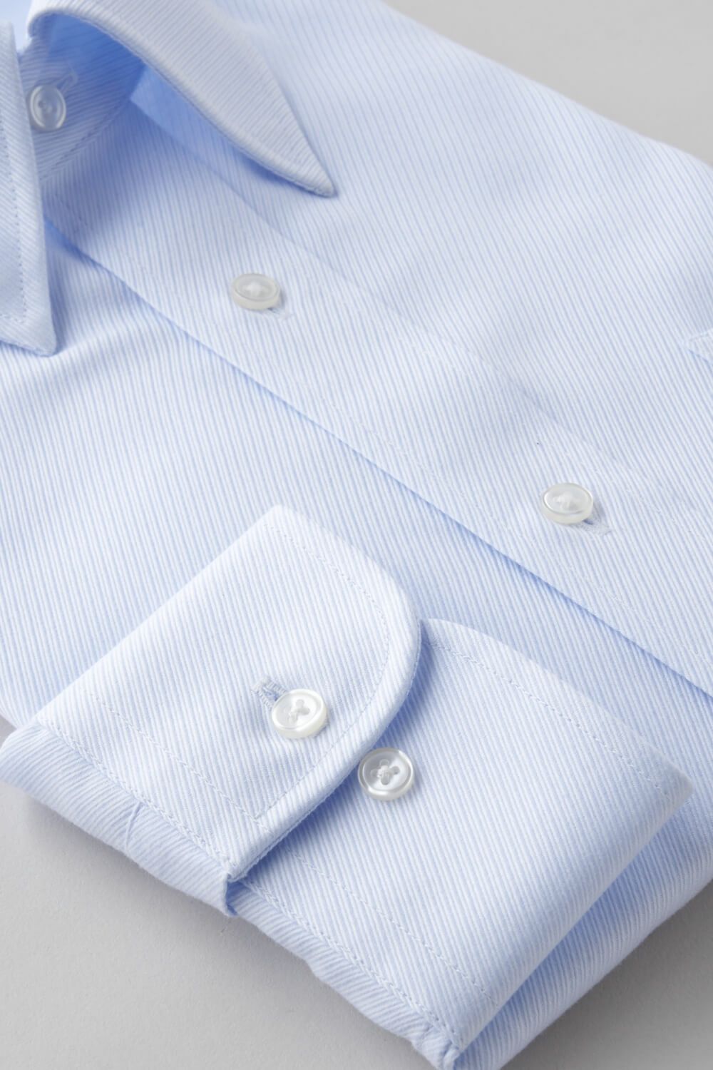 ネクタイを結んだ際のソフトな衿ロールがエレガントなスナップダウンシャツ。