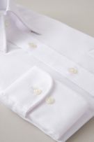 ネクタイを結んだ際のソフトな衿ロールがエレガントなスナップダウンシャツ。