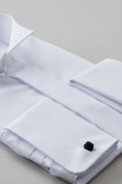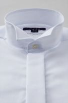 モーニングやタキシードに合わせるのに最適な、前身頃にひだ(ピンタック)のないプレーンなウィングカラーシャツです。