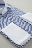 ozieではネクタイとの相性がいいホリゾンタルカラーをダブルカフス仕様にして生産。
