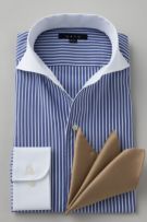 イタリアンカラーと広角なワイドカラーを掛け合わせたスタイリッシュなノーネクタイ専用の衿型です。