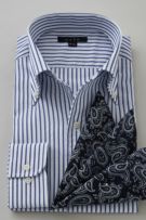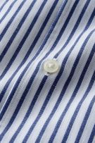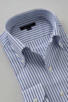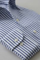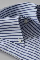 衿と前立ての裏部分がオープンカラーのように縫い目がなく、1枚の生地でつながって出来ているため、第一ボタンをはずして衿を開き気味にして着用すると衿から第一ボタンにかけてきれいなロールが出るようになっています。