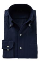 このシャツは衿と前立ての裏部分がオープンカラーのように縫い目がなく、1枚の生地でつながって出来ている、衿開きのいいノーネクタイ専用シャツ。