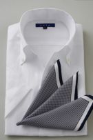このシャツは衿と前立ての裏部分がオープンカラーのように縫い目がなく、1枚の生地でつながって出来ている、衿開きのいいノーネクタイ専用シャツ=イタリアンカラー。