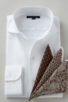 イタリアンカラーと広角なワイドカラーを掛け合わせたスタイリッシュなノーネクタイ専用の衿型です。