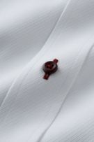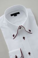 このシャツは衿の一部とカフス部分に赤のサテンテープでパイピングを施しました。