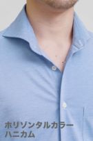 衿型は、衿の開き角度が大きく水平に近いホリゾンタルカラー(カッタウェイ)。