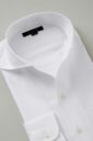 衿と前立ての裏部分がオープンカラーのように縫い目がなく、1枚の生地でつながって出来ているため、第一ボタンをはずして衿を開き気味にして着用すると衿から第一ボタンにかけてきれいなロールが出るようになっています。