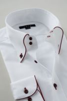 このシャツは衿の一部とカフス部分に赤のサテンテープでパイピングを施しました。