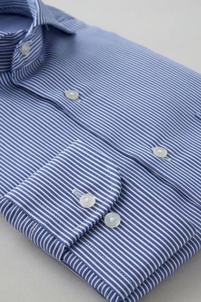 プレミアムコットン使用の綿100%に特殊な形態安定加工を施すことにより、ポリエステル混の形態安定シャツに近い防しわ性があります。