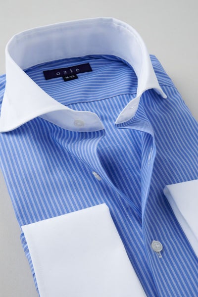 ozieではネクタイとの相性がいいホリゾンタルカラーをダブルカフス仕様にして生産。