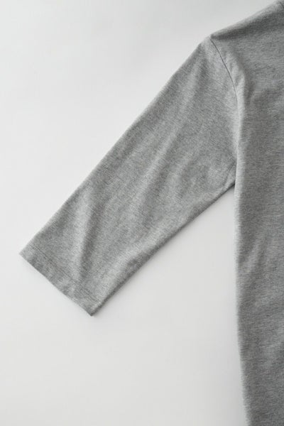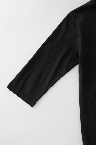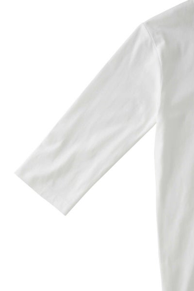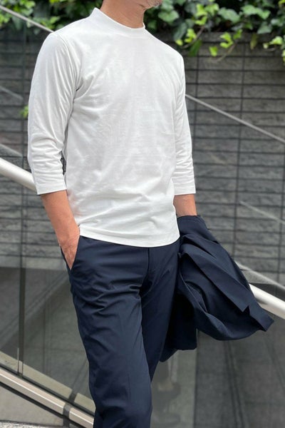 ozieオリジナルの適度な肉厚の40番手度詰め天竺を使ったしっとりとした肌触りと光沢感のあるこのTシャツは、スーツ・ジャケットにあわせるのに最適な上品七分袖Tシャツです。