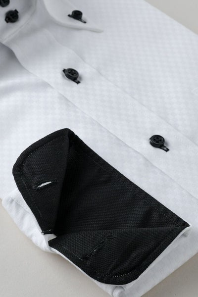 ノータイ時に第一ボタンを外したときに衿裏や前立から黒無地生地がチラッと覗くようアクセントをつけました。