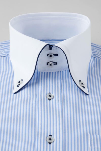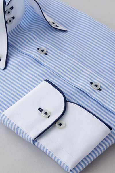 このシャツは白い衿に紺の生地を重ね合わせて作った2枚衿風に見えるよう衿の一部分と、カフス部分に紺のサテンテープでパイピングを施しました。
