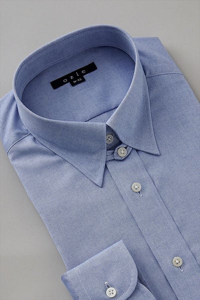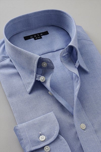 スーピマ綿を使用したドレスシャツの定番生地=ピンポイントオックスフォードに形態安定加工を施した、ブルー無地のタブカラーシャツ。
