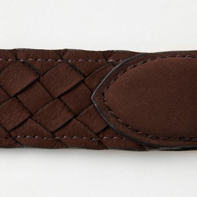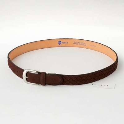 1本の幅を8mmに裁断し編み込んで板状にしプレス、その後ベルト幅30mmに裁断し裏側と縫製と職人技が光るイントレチャート。
