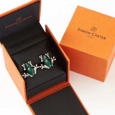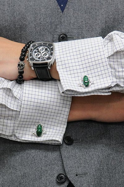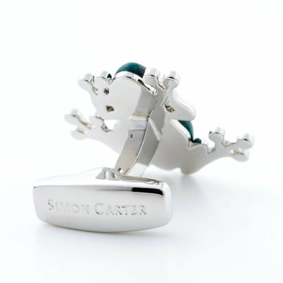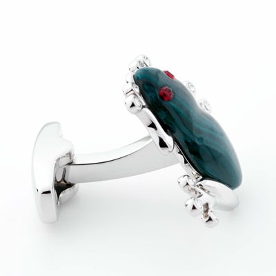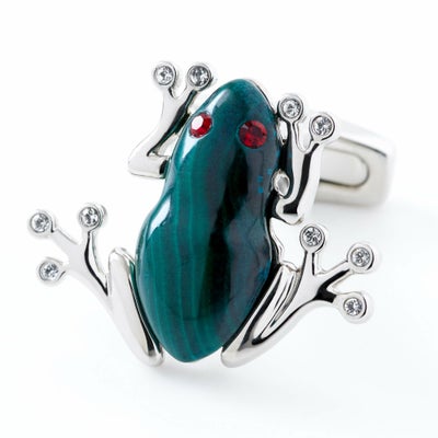 ”相手の心理を見抜く石”、”営業力を高める(セールスマンの石といわれています)”という効果を発揮するパワーストーン=マラカイトとスワロフスキークリスタルの贅沢なコンビネーションのファニーなカエル型カフリンクス