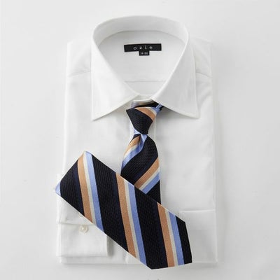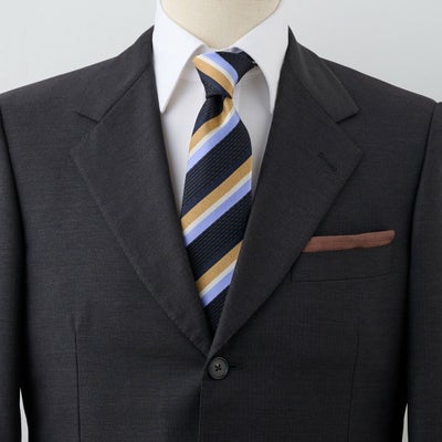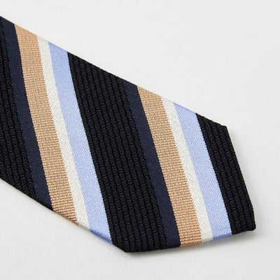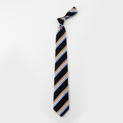 ネイビー地にゴールド、白、サックスブルーのレジメンタル柄。